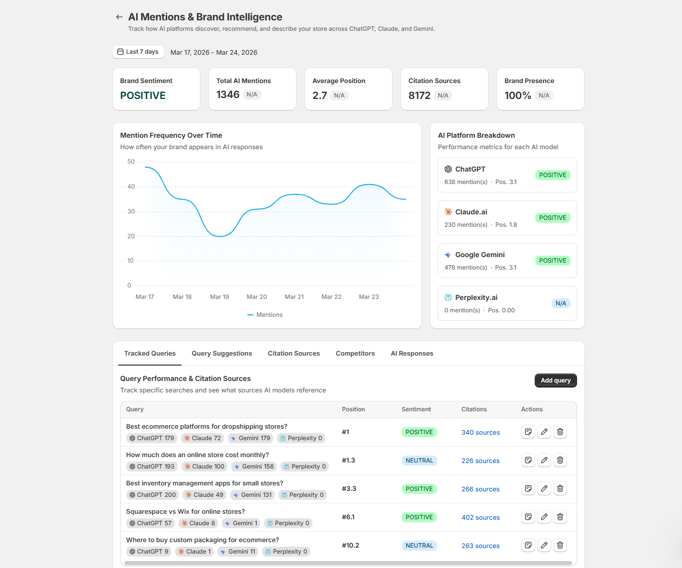 You can now verify exactly how each AI platform describes your store, identify which competitors appear in the same AI responses, and track which sources give you authority in AI recommendations. This is the competitive intelligence layer that helps you understand not just if you're being mentioned, but how and why.